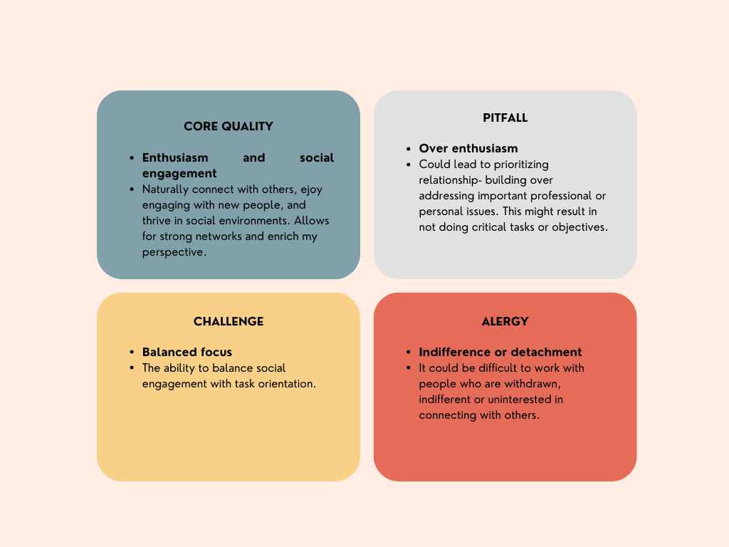 First, my core quality is my enthusiasm and social engagement, which allows me to connect with others on a deeper level. I genuinely enjoy engaging with people and communicating with new acquaintances, finding excitement in each interaction. I am quite social, and I thrive in environments where I can meet and get to know new connections, as this not only broadens my network but also enriches my perspective on various topics. This characteristic could be a huge asset when looking at the business environment, where collaboration and relationships often play a critical role in achieving success. However, my pitfall could be my over-enthusiasm, which might lead me to prioritize socializing at the expense of my other professional and personal goals. I could easily find myself focusing more on fostering good relationships rather than addressing the pressing issues that are occurring at the moment between myself and another person. The risk of this behavior could be that I unintentionally neglect more serious or critical aspects of my work or personal objectives, leading to consequences that might undermine my overall effectiveness and productivity in both settings. Therefore, it’s essential for me to strike a balance between nurturing connections and remaining attentive to the responsibilities that demand my immediate attention.