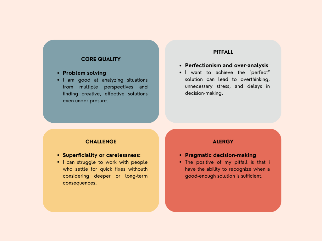 My other core quality could be problem solving. As I already mentioned, I enjoy problem solving in different situations, and if I may say, I’m quite good at it. I can view different situations from different perspectives, which allows me to also look at different possible solutions. This quality makes me efficient when faced with difficult problems, as I employ a methodical approach to tackling challenges. I thrive under pressure, often finding that high-stakes environments fuel my creativity and analytical thinking, leading to innovative solutions. I like thinking outside the box to try and create a solution that not only addresses the immediate issue but also considers potential long-term effects. A pitfall of that could be that I get caught in a problem because I want to find the “perfect” solution to that problem instead of finding a simpler possible solution. This desire for perfection can sometimes lead me down a rabbit hole of over-analysis, which could create unnecessary stress or delay the process by second-guessing myself instead of acting confidently. I have sometimes learned to recognize this tendency and am actively working on balancing my pursuit of excellence with the need for timely resolutions.
